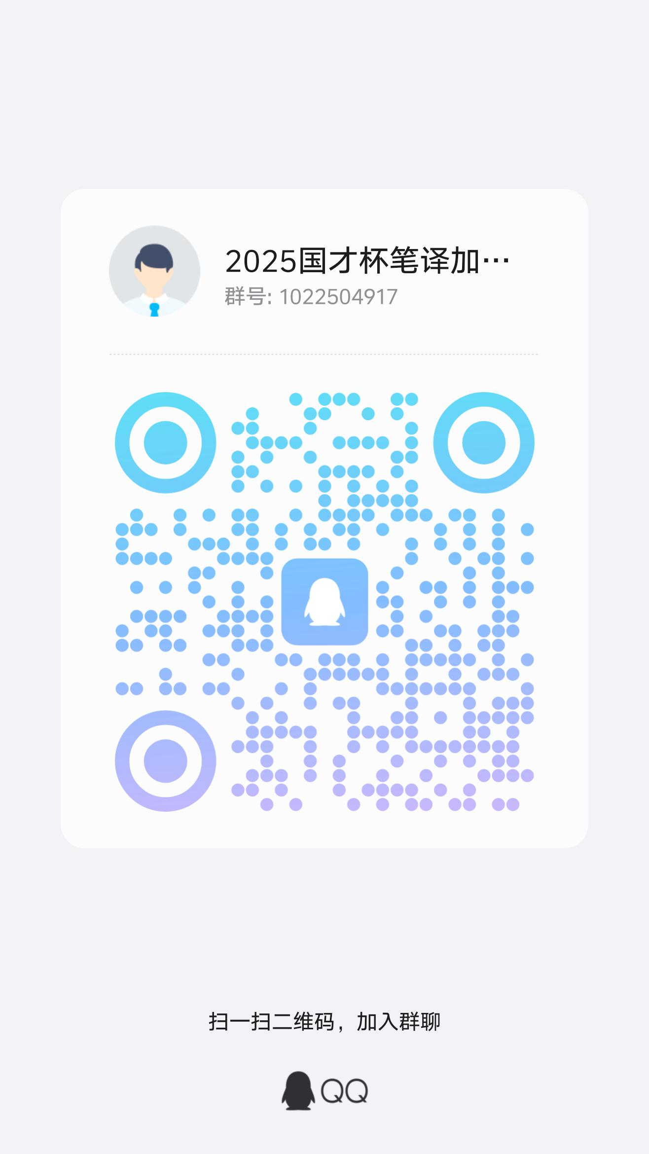 “笔译赛项”参赛注册:登录大赛官网(https://ucc.fltrp.com/),参赛选手须在“选手报名/参赛”页面注册报名“笔译赛项”, 流程可参考官网报名指南,https://mp.weixin.qq.com/s/TIQ5SyRHBQhykzPi6qVWqA。并且,官网提供备赛资源。报名成功后请立即加入“2025国才杯笔译加油站”(QQ群号1022504917)。